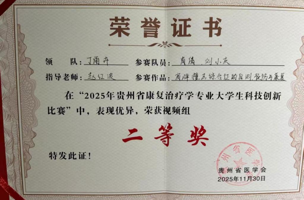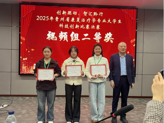 2025年11月29日,由贵州省医学会、贵州省医学会物理医学与康复学分会主办的“2025贵州省康复治疗学专业大学生科技创新比赛”决赛在贵州医科大学附属医院举行。我院康复治疗学专业2023级学生2件作品获奖,分别喜获视频组二等奖1项和优秀奖1项。
