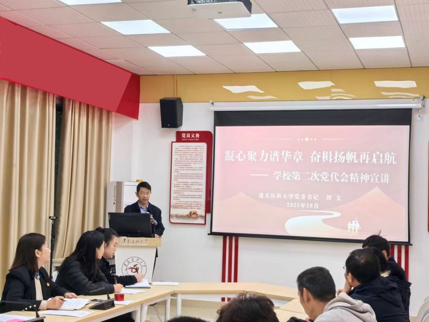 集体学习后,刘文同志以《凝心聚力谱华章 奋楫扬帆再启航》为题,围绕学习贯彻中国共产党遵义医科大学第二次党员代表大会精神,聚焦准确把握此次党代会精神内涵、抓好党代会精神的贯彻落实以及着力在重点工作上求突破等方面为全体党员讲授专题党课。