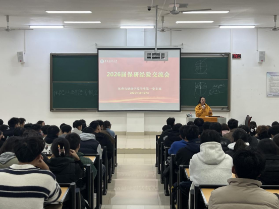 为持续深化学风建设,打造积极进取的学习氛围,帮助同学们明晰学业方向、规划未来发展路径。10月27日下午,体育与健康学院学生第一党支部在新蒲校区第四教学楼34阶梯教室,成功举办2026 届保研经验分享会。学生第一党支部副书记吴培红、辅导员谭芙英、谭佳竹以及23级、24级、25级部分同学参加,会议由吴培红主持。