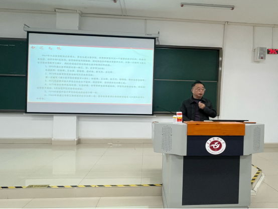 2025年11月5日,遵义医科大学体育与健康学院为 2025 级社会体育指导与管理专业全体同学举行“学院发展史”主题教育讲座。学院关工委副主任、原党委书记汪爱平教授担任主讲,学院党委副书记唐溢主持,学生第一党支部辅导员谭芙英、谭佳竹参加。